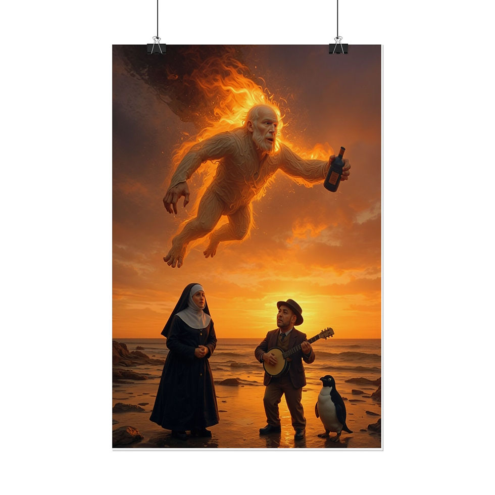 Whiskey from Heaven beach scene posters | angel nun banjo man penguin